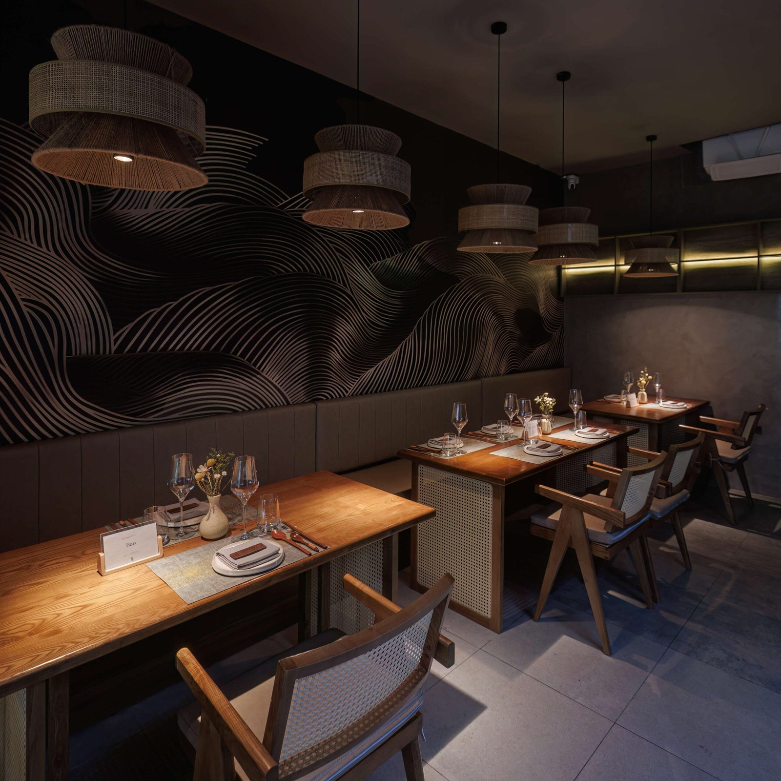 ORYZ spans two floors, each designed for shared experiences, alongside a private area for intimate gatherings. Earthy gray and beige tones set a calming backdrop, while raw concrete textures and bamboo-inspired furnishings add a grounded, welcoming feel. Our bar now becomes a focal point as well, offering craft cocktails and East Asian-inspired beverages that complement the communal dining experience.